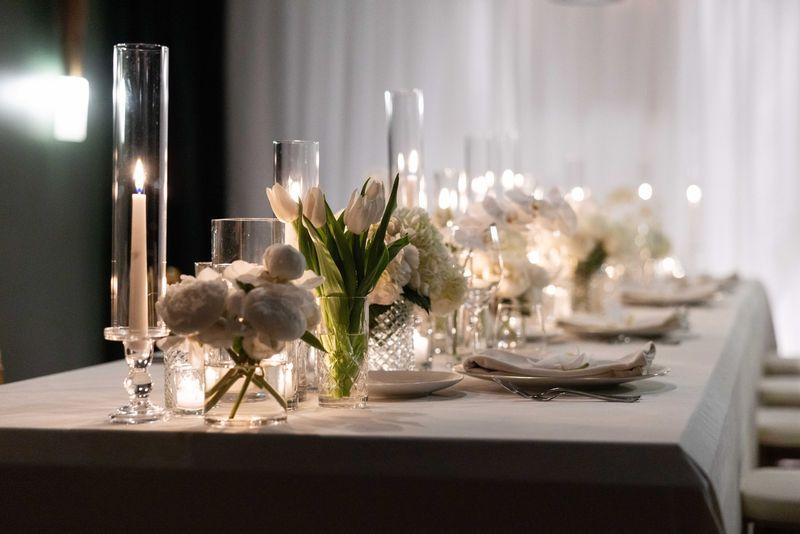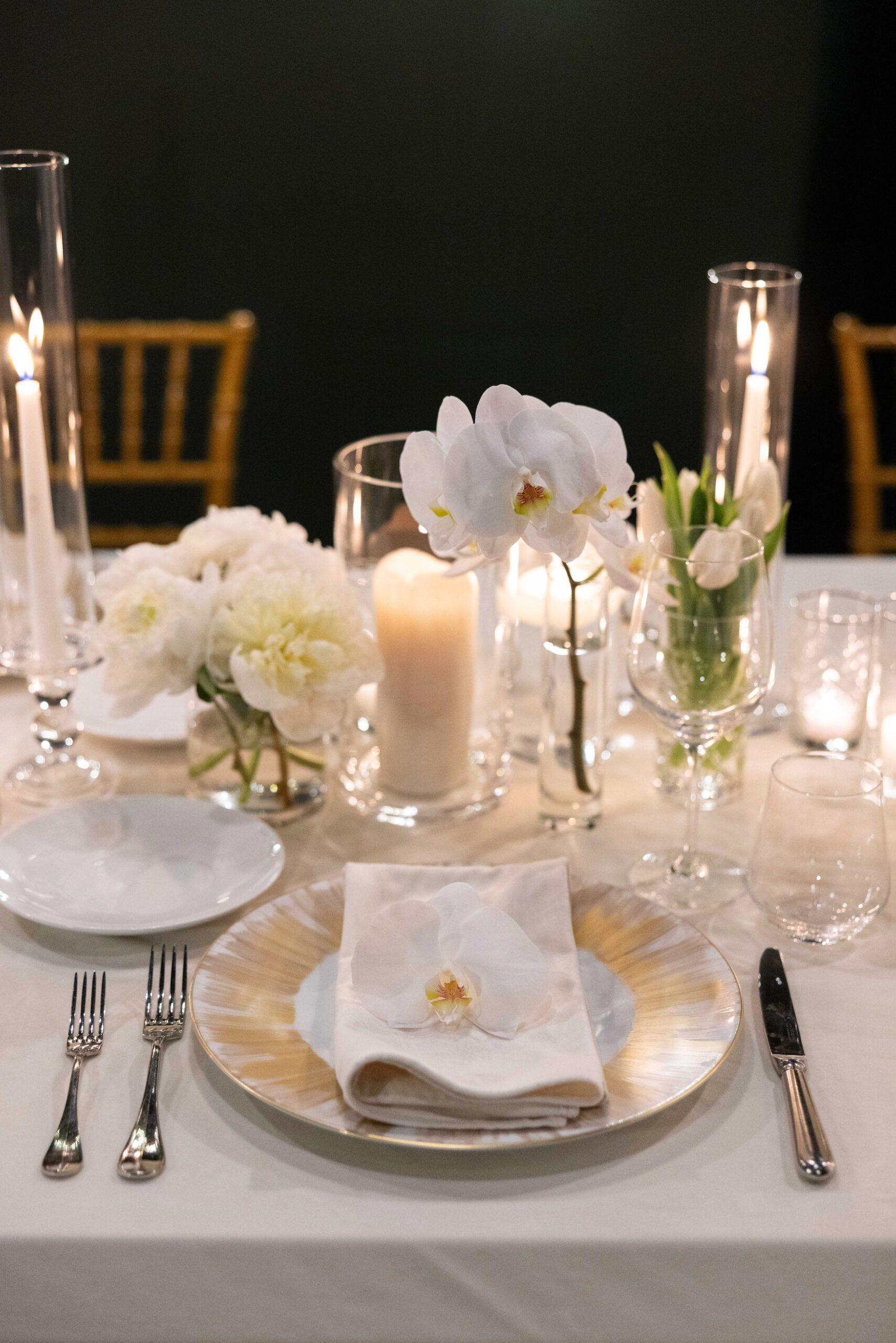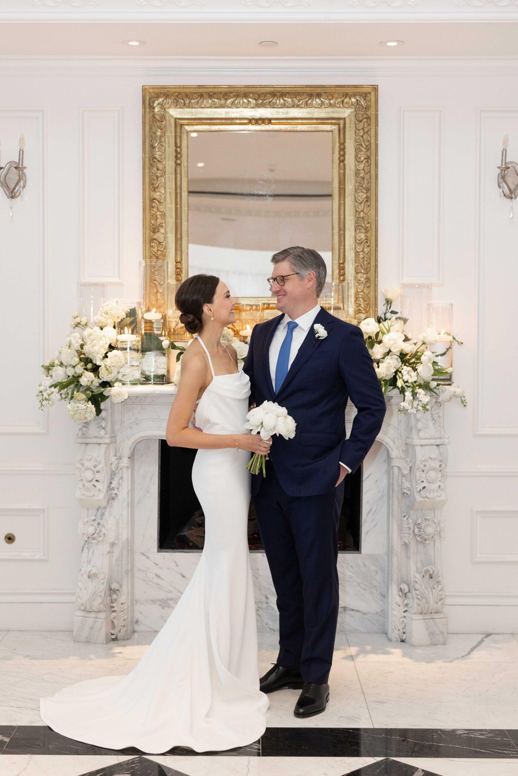 Carey and Jon chose to exchange vows in a serene private space of the black and white ballroom at the hotel surrounded by their closest family members. The setting was effortlessly elegant, with minimal white floral touches and soft ambient lighting from the candles. This created a warm and romantic atmosphere as the sun was setting through the ballroom windows.