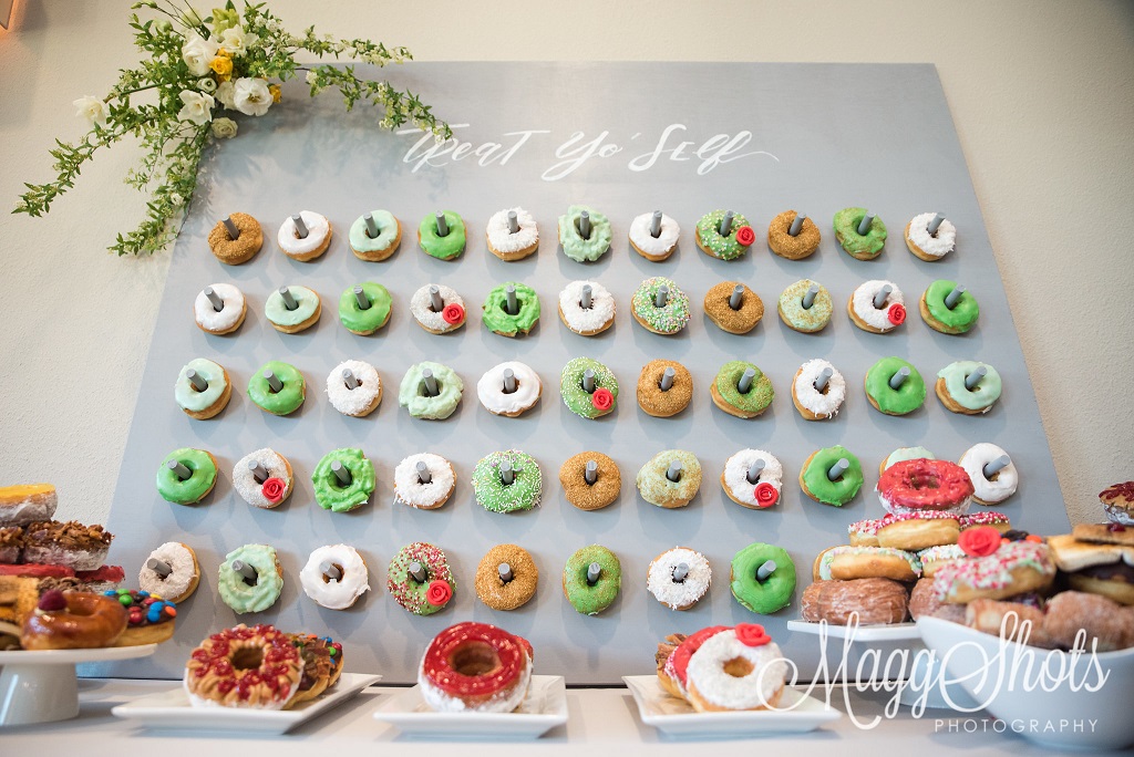 Venue: The Laurel // Photographer: MaggShots Photography // Hair and Makeup: Tracy Melton Artistry // DJ: Leforce Entertainment // Florist: Pollen Events // Catering: Gil’s Elegant Catering // Outdoor Games and Lounge Furniture: Junk and Disorderly // Donuts: Jaram’s Donuts // Transportation: MUV Transportation // Lettering on Donut Wall: Viv Jordan Studios