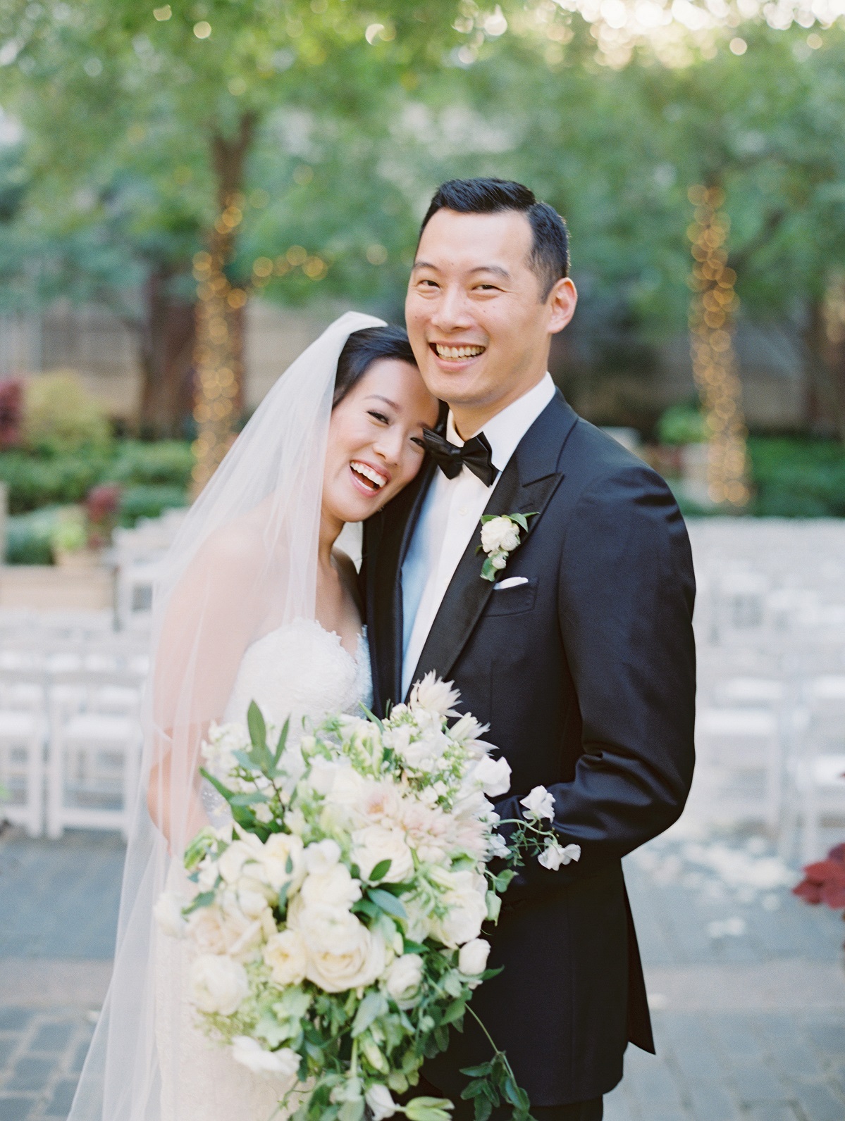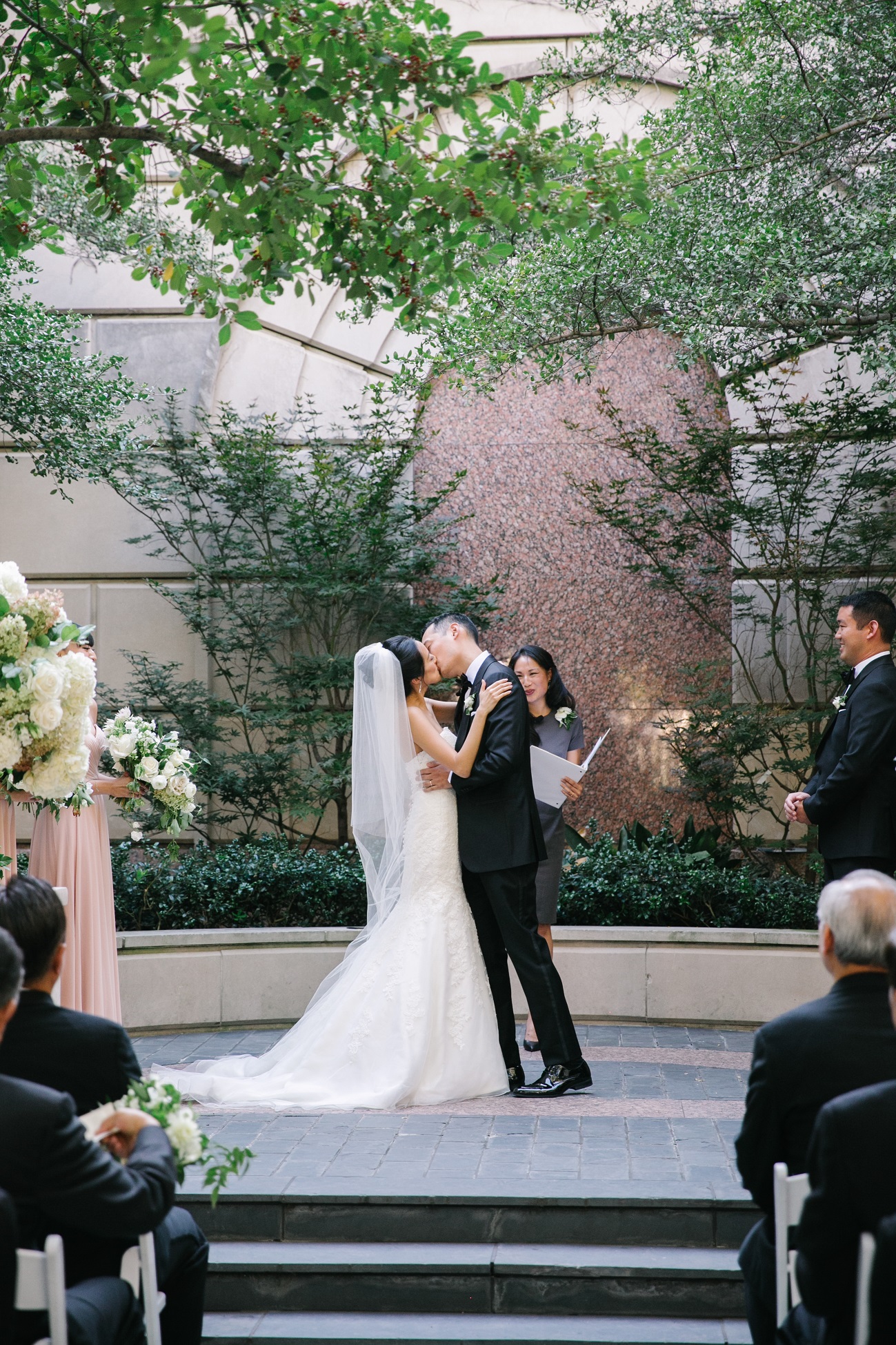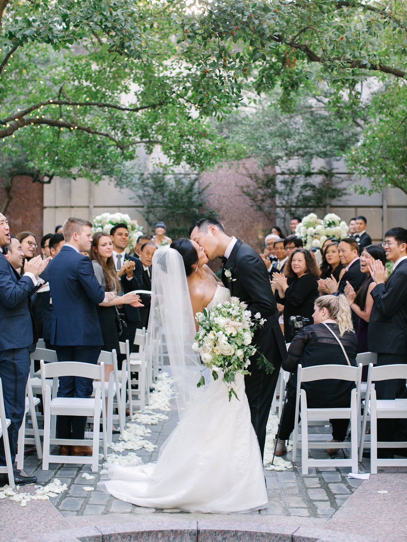 Jasmine and Mitchell’s wedding is stunning! It’s on a hot, October day at the beautiful Hotel Crescent Court in the courtyard (where the two had first gotten engaged!) Jasmine and Mitchell looked as if they had just walked off the cover of a magazine. It was a true fairy tale for them – Mitchell’s niece and nephew even refered to Jasmine as “Princess Jasmine!” The ceremony included two beautiful worship songs and an Asian Tea Ceremony.