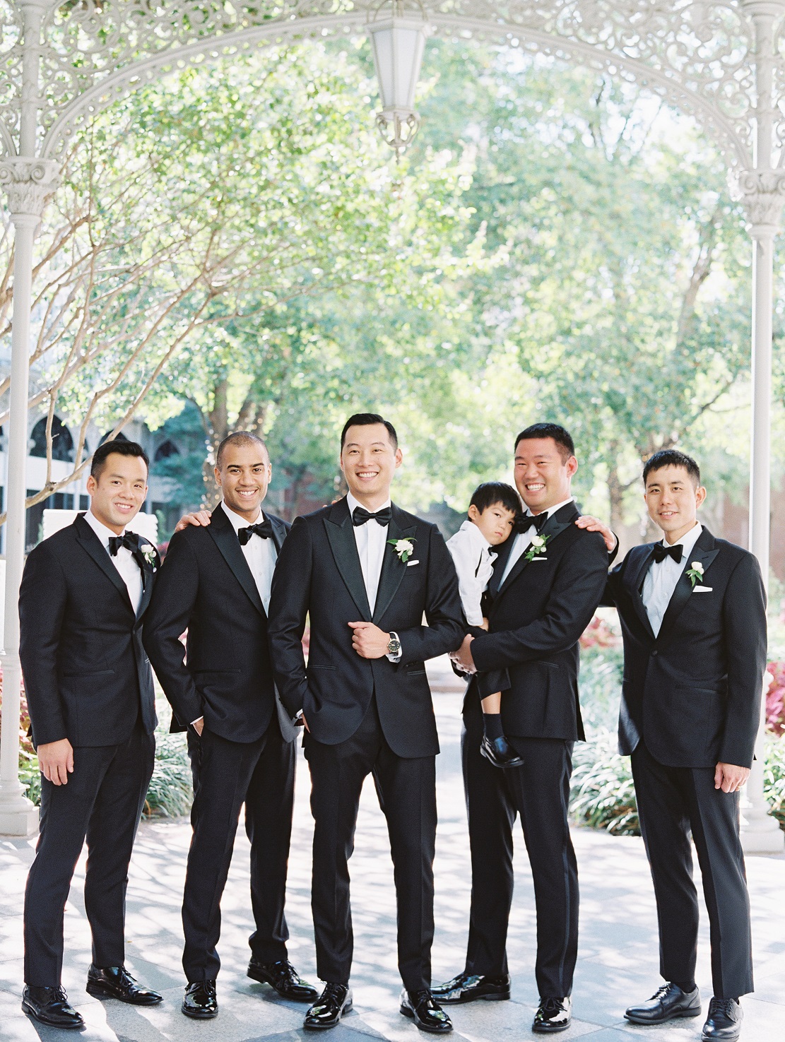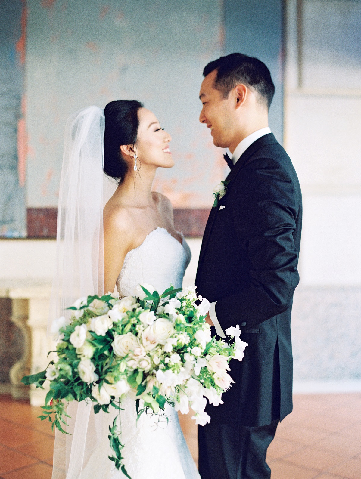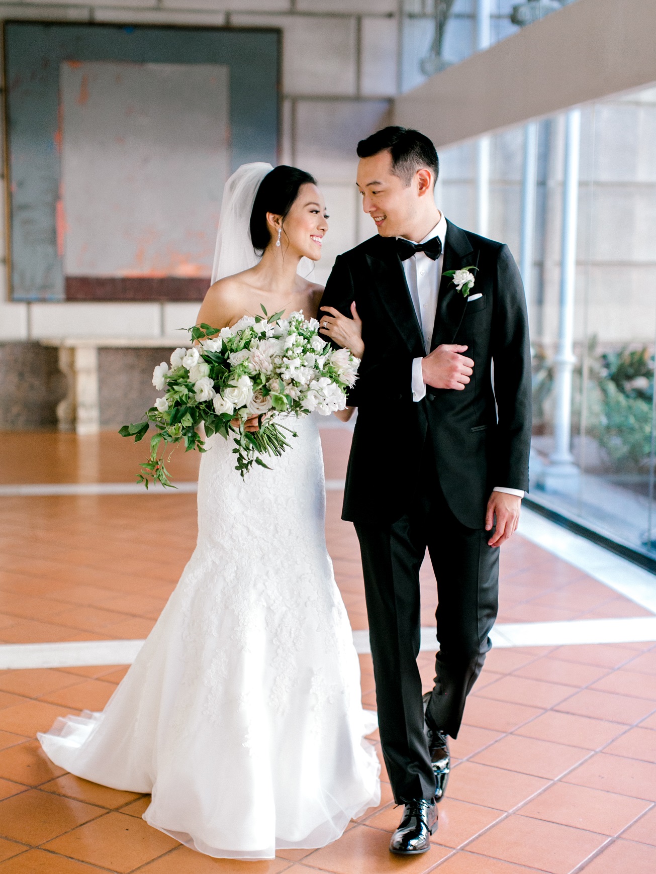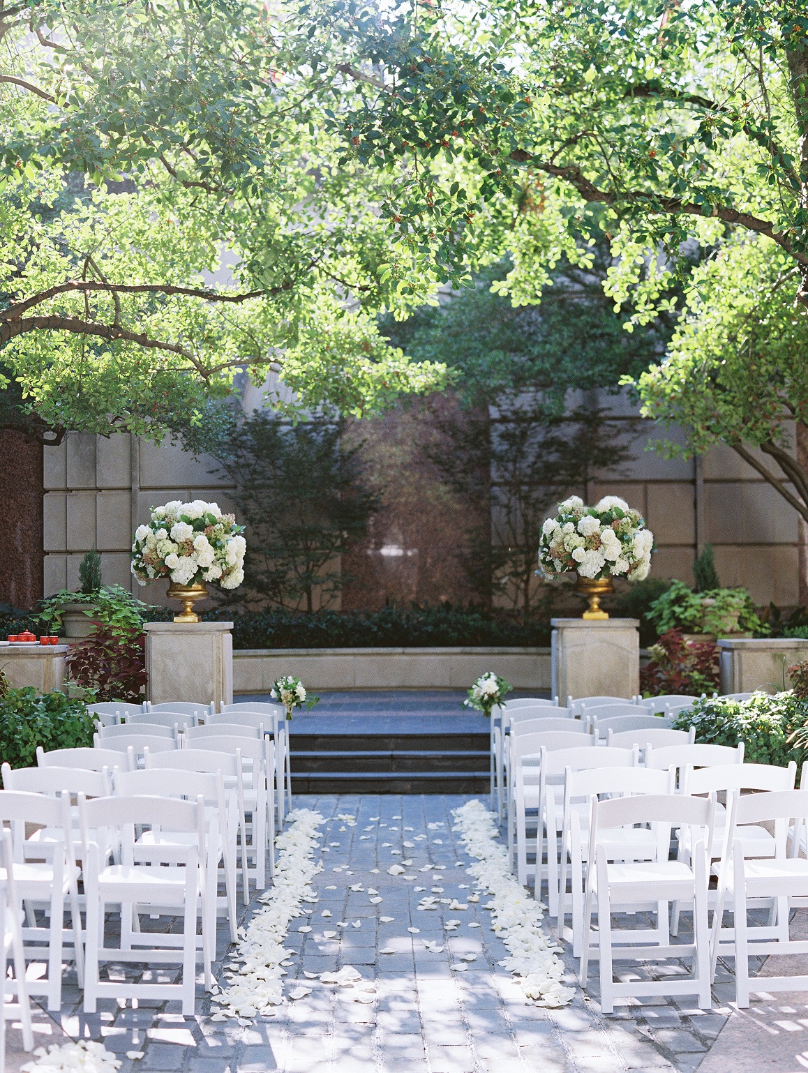 Jasmine and Mitchell’s wedding is stunning! It’s on a hot, October day at the beautiful Hotel Crescent Court in the courtyard (where the two had first gotten engaged!) Jasmine and Mitchell looked as if they had just walked off the cover of a magazine. It was a true fairy tale for them – Mitchell’s niece and nephew even refered to Jasmine as “Princess Jasmine!” The ceremony included two beautiful worship songs and an Asian Tea Ceremony.