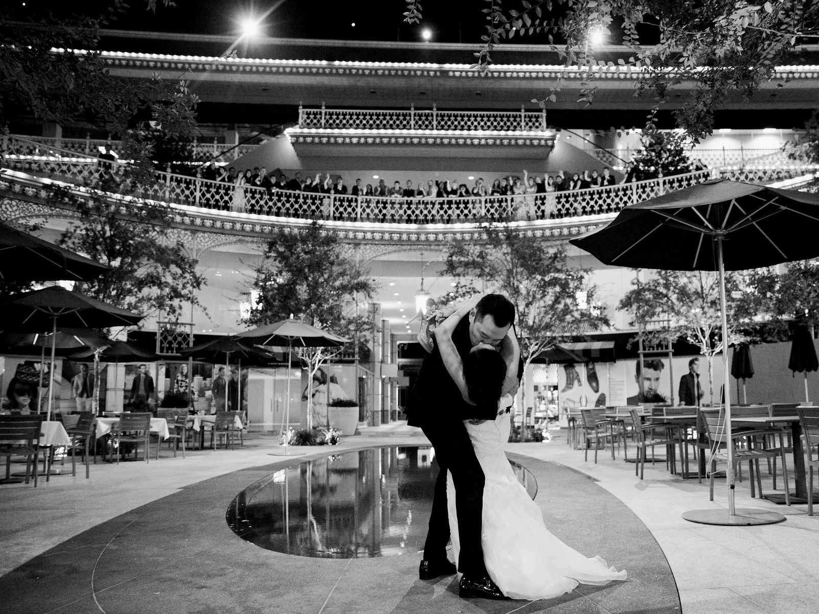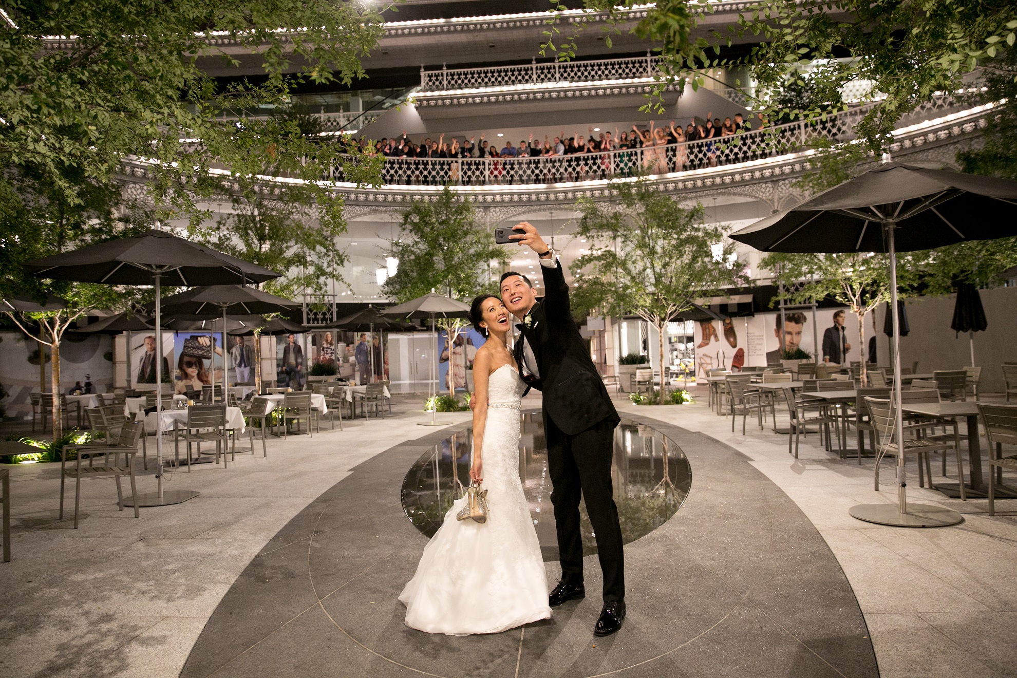 The reception was a PARTY with the Shoe Game, Photobooth, and great dancing! Jasmine and Mitchell wrapped up the night by having a sweet, private moment back in the courtyard where they said “I Do” earlier that day, and “Yes” to a proposal months before. Guest lined the balcony to wave the newlyweds off and send them their best wishes.