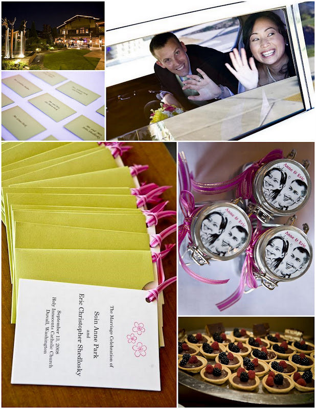 Willows Lodge is known for their incredible cuisine, as the Chef from the Barking Frog Restaurant across the street provides the Catering. Anne and Eric selected a savory menu filled with appetizers like Kahlua Pulled Pork Sliders with Mango Salsa, Seven Spice Tuna Lollipops with Sweet Ginger Lime Glaze, and Uli Lamb Sausage in a Blanket with Fresh Three Seed Mustard…just to name a few! Dinner included Candied Bacon-Wrapped Beef Tenderloin with Caramelized Shallots and Blackened King Salmon with Blueberry Nectarine Chutney…to die for! As if that weren’t enough, on top of their delicious cake from Creme de la Creme, guests drooled over Tiramisu Petit Fours and Raspberry Ganache Tarts. Yum!