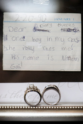 * Below is a picture of a note Sarah had written in her journal in first grade, talking about how a boy named Nathan Gai liked her. How sweet is this?! She framed that note and we placed it at her reception for everyone to melt over. Too cute!