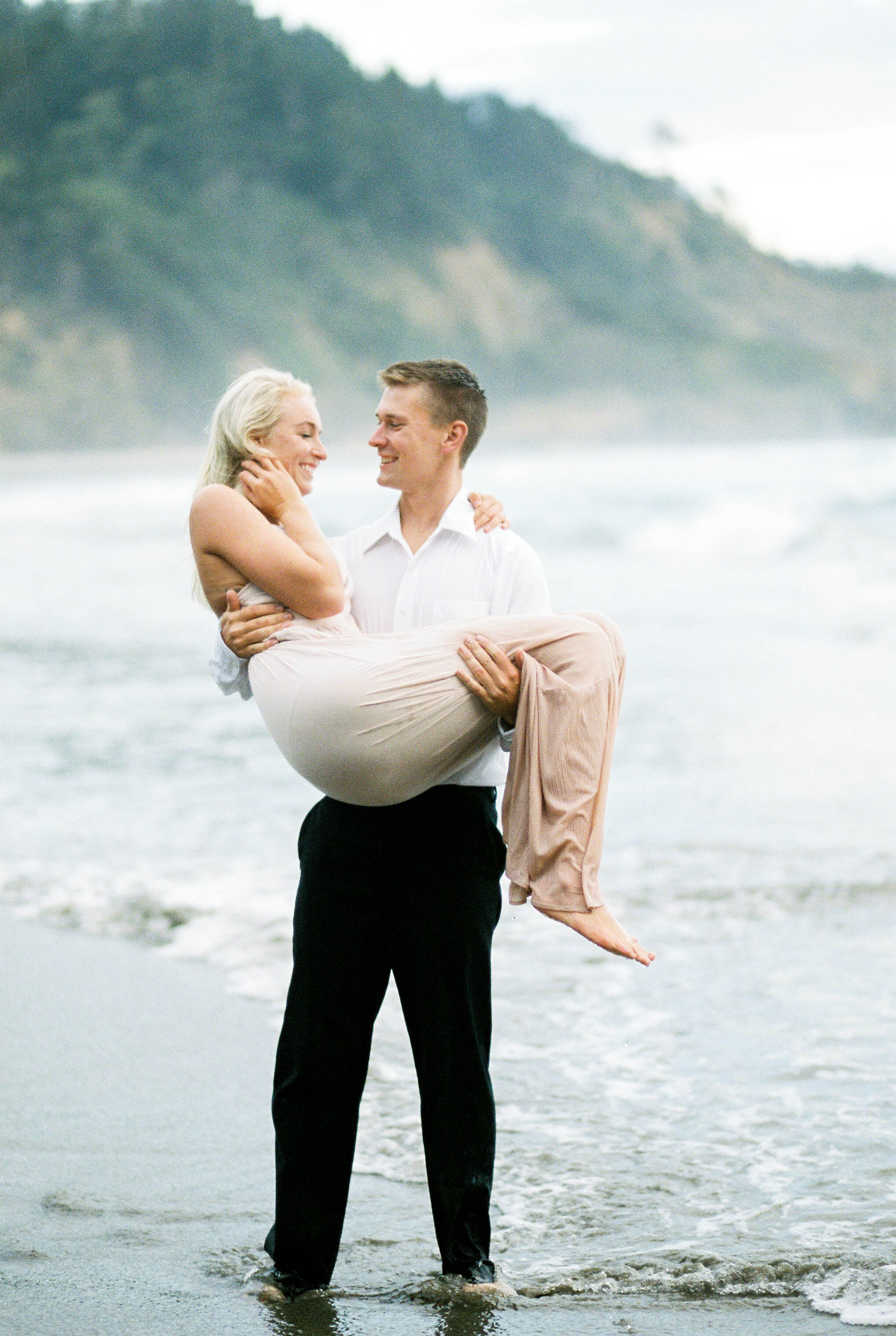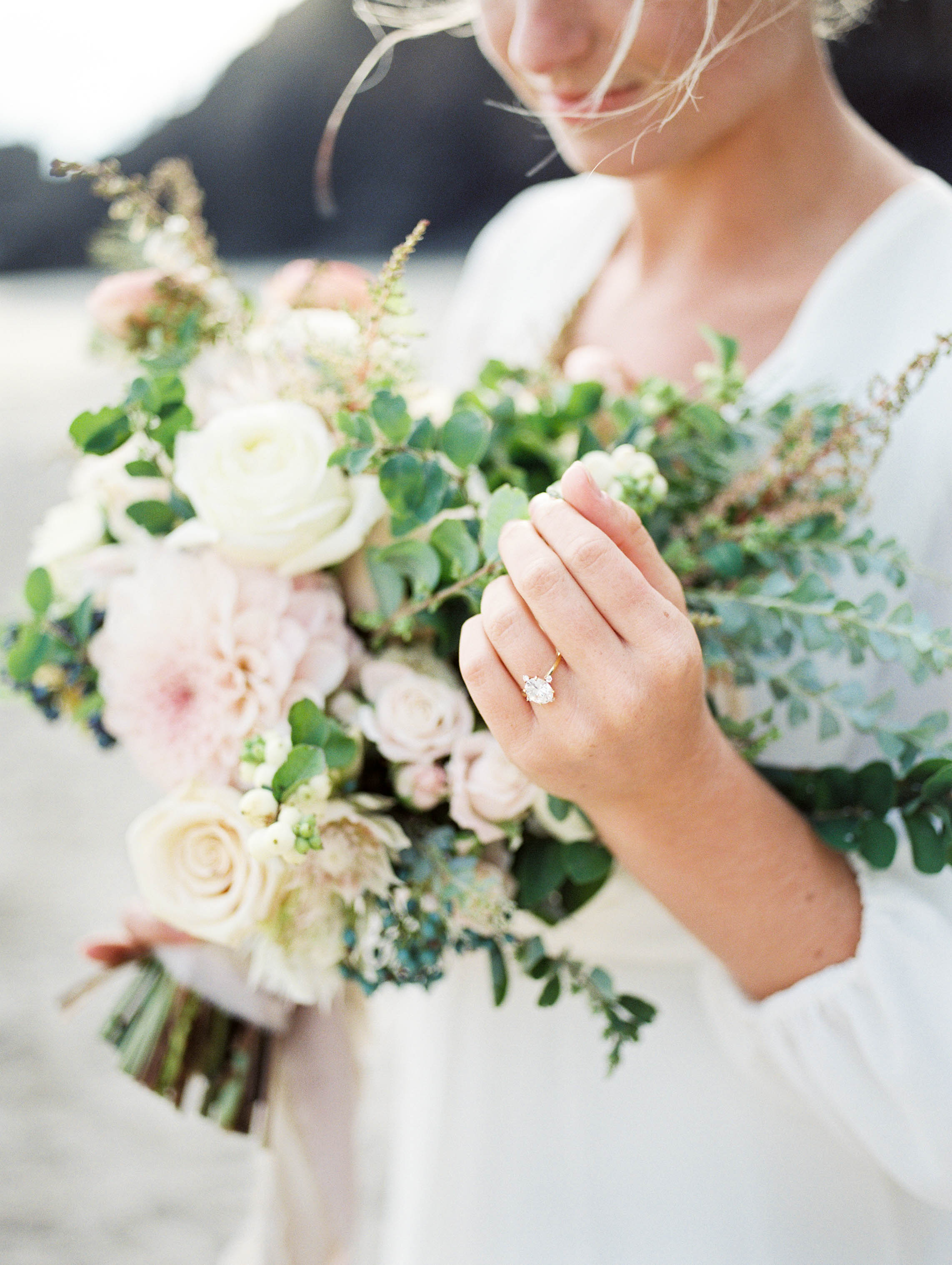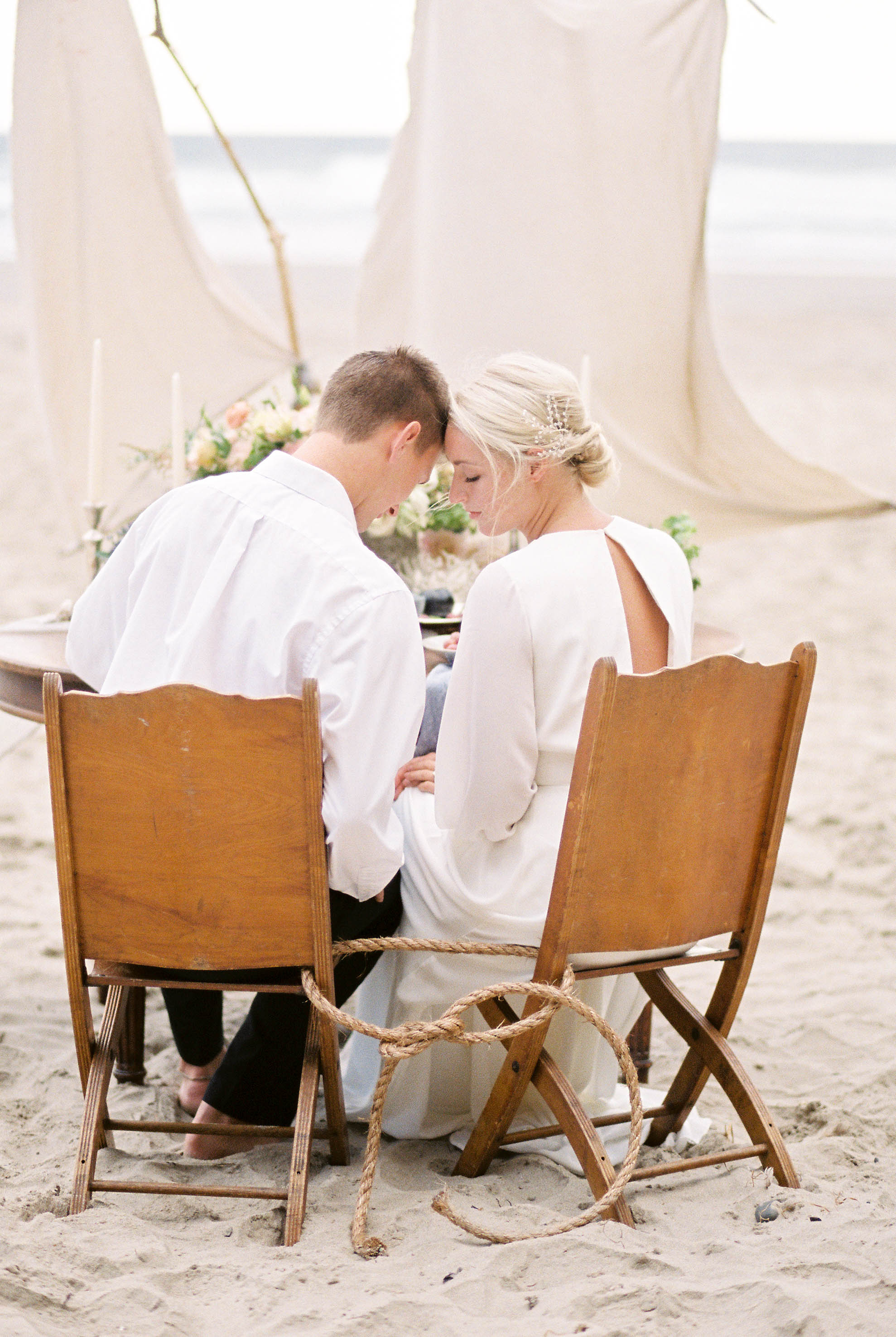 Every time we go to the west coast, our hearts skip a beat. It’s no wonder why Oregon beaches are such a hot spot for elopements and intimate weddings. The inspiration for this shoot was brought on thru our maritime love. We wanted to create a true beach elopement. Classic romance is the vibe we were aiming for with the bride’s soft movement dress and handmade hairpiece. The color palette has the perfect amount of neutral greens and ivories with pops of pale pink and dusty blues. The décor which included sails, shells and coral combined beautifully together to showcase the Oregon coast.